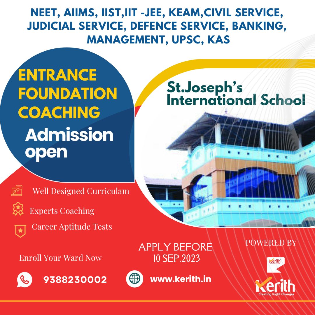 NEET, AIIMS, IIST,IIT -JEE, KEAM,CIVIL SERVICE, JUDICIAL SERVICE, DEFENCE SERVICE, BANKING, MANAGEMENT, UPSC, KAS ഉൾപ്പടെ വിവിധ എൻട്രൻസ് പരീക്ഷകൾക്കുവേണ്ടി വിദ്യാർത്ഥികളെ പരിശീലിപ്പിക്കുന്ന *കെരീത്ത് എൻട്രൻസ് അക്കാഡമിയും ST. ജോസഫ്’ സ്കൂളും സംയുക്തമായി V മുതൽ XII വരെ ക്ലാസ്സുകളിൽ പഠിക്കുന്നവർക്ക് എൻട്രൻസ് ഫൗണ്ടേഷൻ കോച്ചിങ് ആരംഭിക്കുന്നു*
